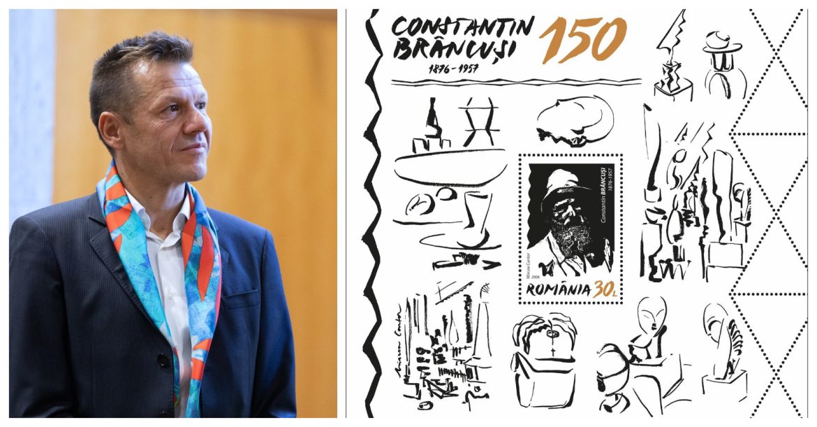 Emisiune de mărci poștale dedicată lui Brâncuși, realizată pe baza desenelor lui Mircea Cantor
