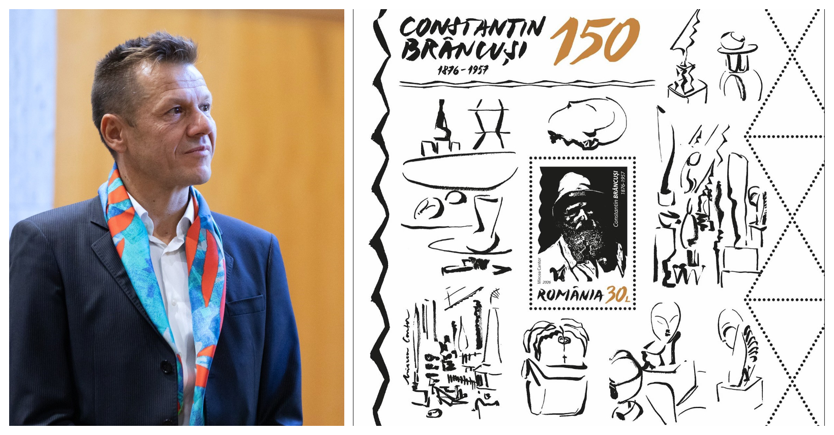 Născut în 1977 la Oradea, Mircea Cantor a studiat la Universitatea de Artă și Design din Cluj-Napoca și ulterior a continuat să-și dezvolte abilitățile în Franța, stabilindu-se acolo. Ca artist avangardist, el a explorat diverse medii, incluzând pictura, sculptura și desenul. Recent, portretul său al lui Brâncuși, realizat folosind tehnica linogravurii, a fost selectat pentru a apărea pe timbrul central al acestei emisiuni. Timbrul are o valoare nominală de 30 de lei și înfățișează nu doar portretul artistului, ci și elemente simbolice legate de creațiile și viața lui Brâncuși.